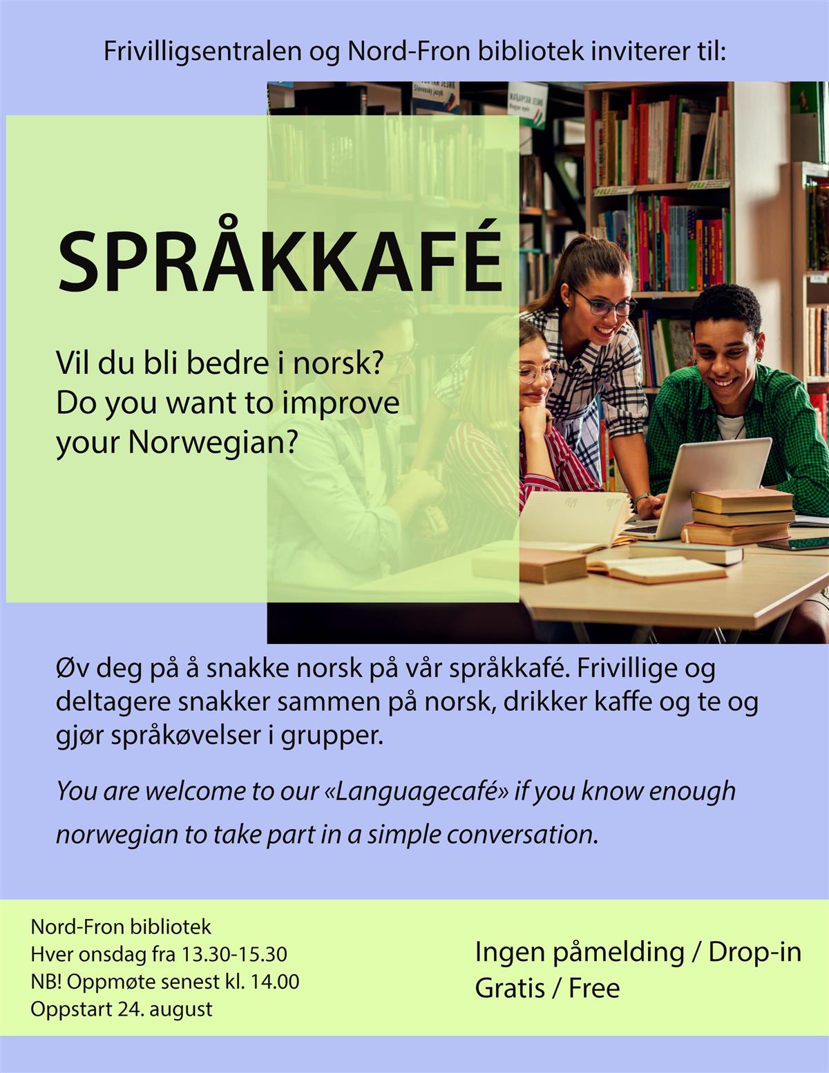 Språkkaféen er et møtested for personer som ønsker å øve på norsk sammen med andre. Den ledes av frivillige og møtes på biblioteket onsdag fra 13.30-15.30.